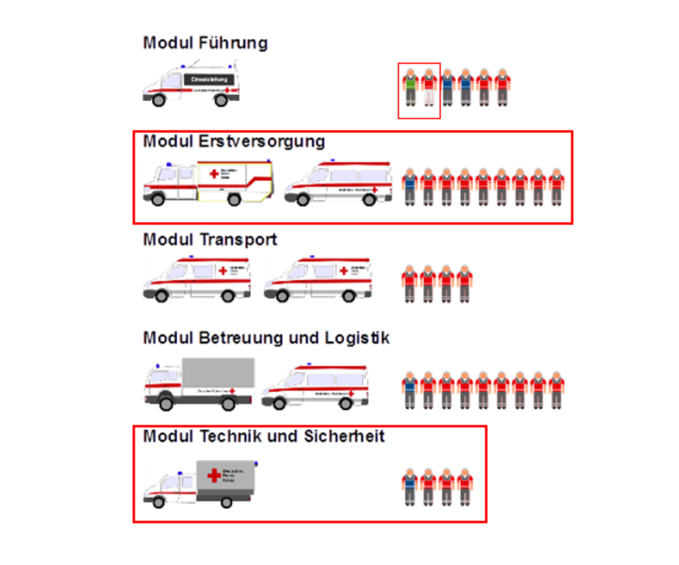Auch das DRK ist Teil dieser staatlichen Aufgabe. Es kommt dann zum Einsatz, wenn der normale Rettungsdienst viel Unterstützung benötigt. Organisiert ist die Hilfe dabei in sogenannten Einsatzeinheiten. Diese sind in Baden-Württemberg standardisiert und bestehen aus 32 Helfern, standardisiertem Material sowie einer festgelegten Zahl von Fahrzeugen. Die Einsatzeinheiten können mit ihren Mitteln Verletzte behandeln oder transportieren, oder auch sogenannte Behandlungsplätze zur Versorgung von Verletzten an einem Schadensort aufbauen. Auch eine große Anzahl unverletzter Personen kann durch die Helfer des DRK betreut und versorgt werden.